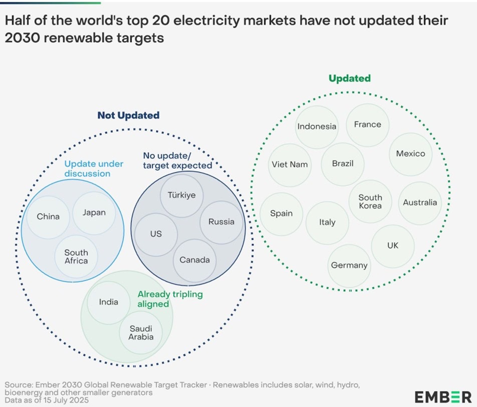 Across the world’s 20 largest electricity-generating countries, national ambitions for renewable energy have shown little movement. The United States, for instance, still lacks a national 2030 renewable energy target. Moreover, the repeal of the Inflation Reduction Act (IRA) through the so-called “One Big Beautiful Bill” significantly weakens the policy framework, and no new targets are expected in the near future, according to Ember.